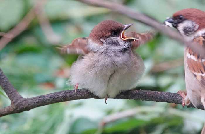 Auch beim Feldsperling, ebenfalls ein regelmäßiger Brutvogel am Drachensee, werden ausgeflogenen Jungvögel noch einige Zeit fleißig gefüttert. Sie ähneln bereits ihren Eltern. Die Farben des Federkleids sind aber bei genauerem Hinsehen matter. Die gelblichen Schnabelwülste dagegen sind nicht nur beim jungen Feldsperling ein typisches und unverwechselbares Zeichen für einen Jungvogel.