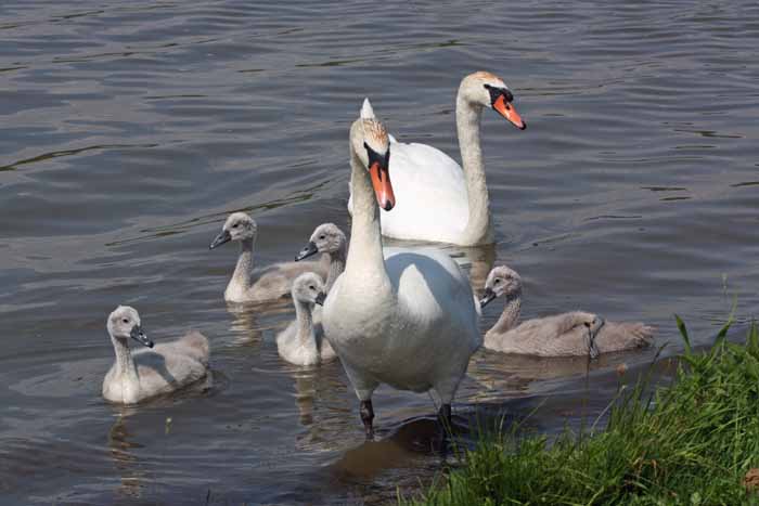 Mit einer Länge bis zu 160 Zentimeter, einer Flügelspannweite bis zu 250 Zentimeter und einem Gewicht der schwereren Männchen bis zu über 15 Kilogramm ist der Höckerschwan eine wirklich beeindruckende und impossante Vogelart. Namengebend und zugleich unverwechselbar ist der schwarze Höcker an Schnabel und Stirn. Dieser ist beim männlichen Schwan, besonders während der Brutzeit immer stärker ausgeprägt als beim Weibchen. Ein besonders charakteristisches Merkmal, vor allem bei den erwachsenen Tieren, ist der orange-rote Schnabel mit einer schwarzen Spitze, die ihn von den seltenen schwarzgelb schnäbeligen Zwerg- und Singschwänen unterscheidet die auch schon am Drachensee als kurzzeitige Wintergäste festgestellt werden konnten. Wohl am auffälligsten ist aber das rein weiße Gefieder, das bei Schwanenküken meist grau und bei älteren Jungschwänen noch mit braunen Federn durchmischt ist.