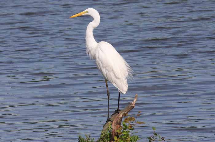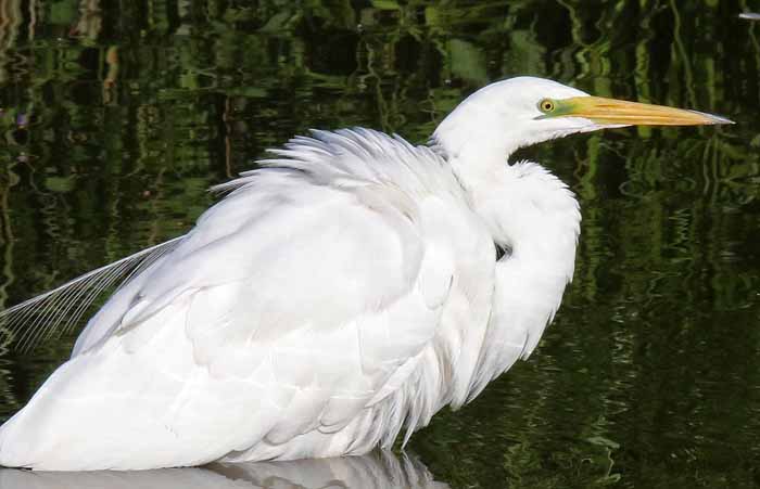 Heute gehören Silberreiher in allen Monaten des Jahres zum Erscheinungsbild des Drachensees. Vornehmlich aber im Winterhalbjahr von jetzt September/Oktober bis ungefähr April fällt er selbst Nichtfachleuten sofort und oft in größerer Anzahl auf die ihn früher meist als Storch bezeichnet haben. Silberreiher sind ungefähr so groß wie der im letzten Drachenseegeschnatter vorgestellte Graureiher, sie wirken jedoch viel schlanker, haben einen besonders auffallend langen Hals und erscheinen dadurch noch graziler und eleganter als Graureiher. Vor allem aber ist aber ihr Gefieder reinweiß. Auffallend sich auch der gelbe bis gelborange Schnabel - zur Brutzeit schwärzlich - sowie die dunklen Beine und Füße. Im Gegensatz zum auch reinweißen, aber viel kleineren Seidenreiher, der auch in ein bis zwei Exemplaren am Drachensee alljährlich auf dem Durchzug beobachtet werden kann, besitzt der Silberreiher auch keine Schmuckfedern am Kopf. Im Frühjahr kann man aber einzelne Exemplare in ihrem Prachtkleid mit auffallenden Schmuckfedern auf dem Rücken entdecken.