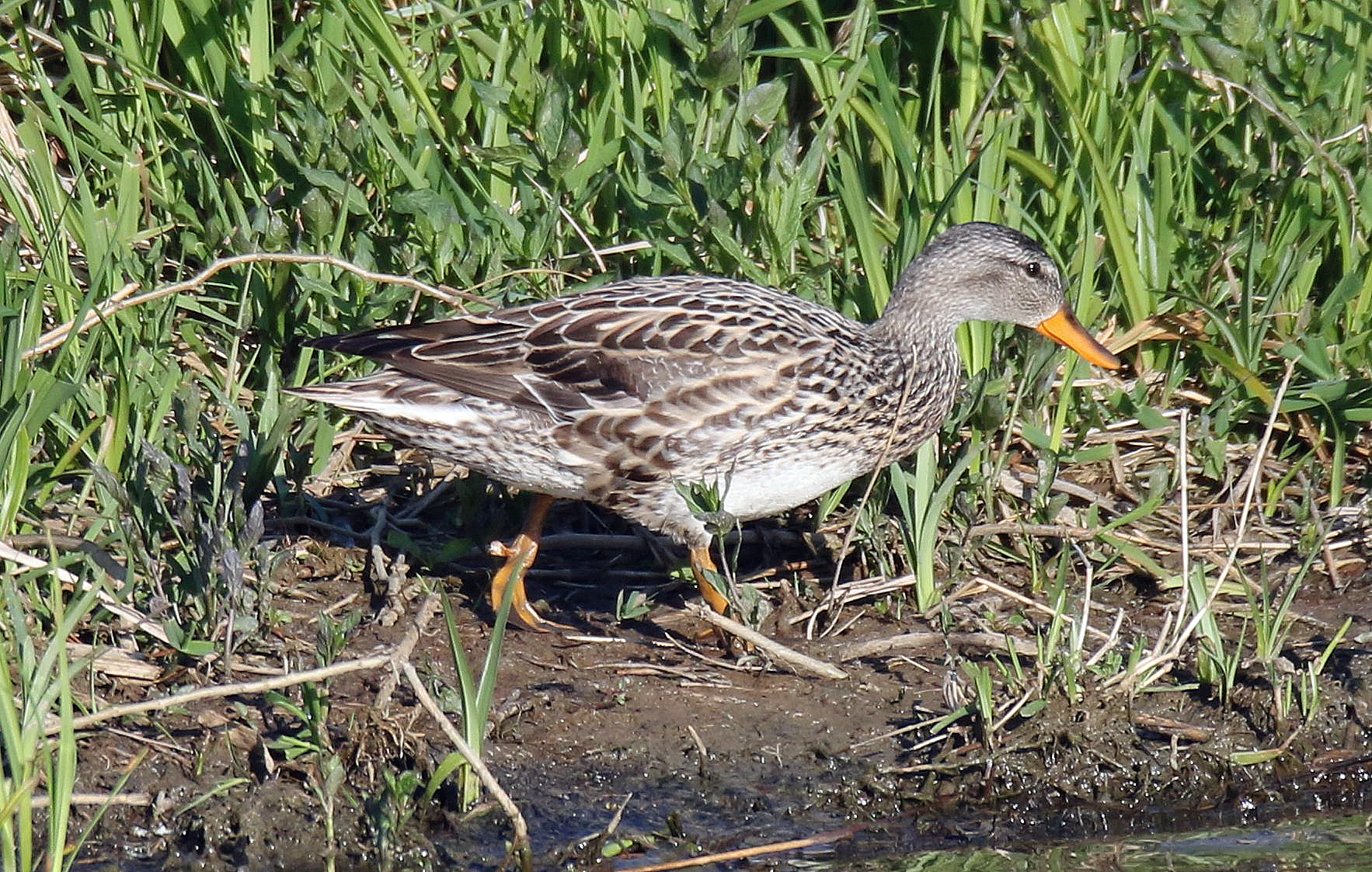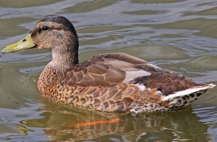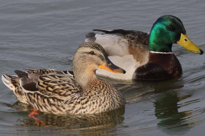 Neben den am Drachensee nachgewiesenen Gründelenten Krick-, Knäk-, Schnatter-, Löffel-, Spieß und Pfeifente ist die Stockente wohl die mit Abstand bekannteste Art. Vor allem die Männchen, die Erpel, zeigen derzeit wieder in Prachtkleid viele unverwechselbare Bestimmungsmerkmale: Ein prächtig metallisch grüner Kopf, ein schmaler weißer Halsring, ringelförmig aufgerollte Steuerfedern, die braune Brust, die orangen Füße oder der auch immer mattgelbe oder grünlichgelbe Schnabel. Auch der "Flügelspiegel", ein metallisch blaues, weiß gesäumtes Band am Hinterrand der Flügel, ist vor allem auch im Flug ein gutes Erkennungsmerkmal. Das Weibchen ähnelt mit seiner unauffälligen bräunlichen Grundfärbung sehr allen anderen Schwimmenten. Besondere Kennzeichen sind nur die Größe, der Flügelspiegel, der orangebraune Schnabel oder auch die typischen Rufe.